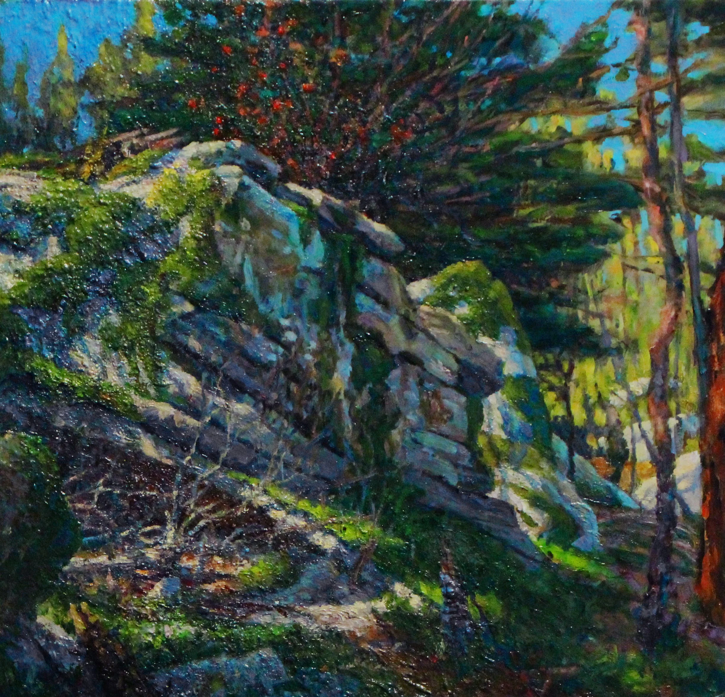 Preparing a wilderness-inspired mural commission for a new contemporary Great Camp on Lake George, I spent three weeks trekking the High Peaks area of the Adirondack Mountains in search of covert, upland viewpoints worthy of study. Making sketches toward a final proposal, the experience of working among elaborate and nearly unblemished natural settings became part of the conceptual foundation leading to realization---the immersion of experiential discoveries in wild landscapes, through painting.